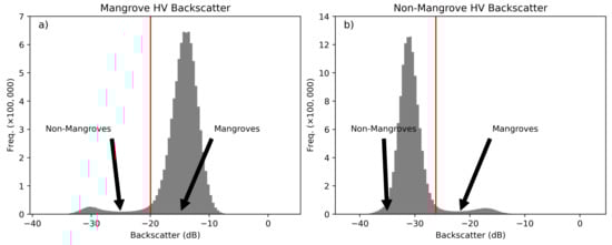 Example histograms with the thresholds for defining (a) mangrove and (b) non-mangrove thresholds.