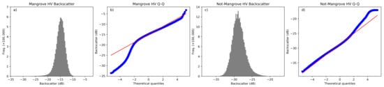 Illustrating the histograms of 2010 HV ALOS PALSAR backscatter from the 2010 mangrove baseline and non-mangrove contextual regions for project GMW-09-003, Sumatra, Indonesia. These histograms are representative of the other projects and both HH and HV polarisations. (a) The mangrove HV histogram and (b) Q-Q plot illustrating that the majority of the histogram is normal will a short tail in the lower values. (c) The non-mangrove HV histogram and (d) Q-Q plot illustrating that the majority of the histogram is normal with a small tail in the higher values.