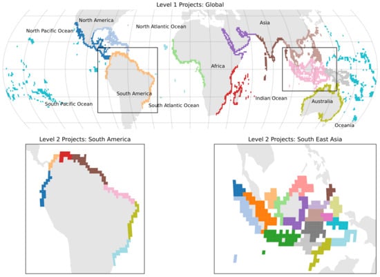 An updated version of GMW geographic projects from [27] used to define the change thresholds. The projects are defined in two levels, the first as broad geography areas (e.g., South America) and then within those regions, the second level of projects are defined. Examples are shown for South America and South East Asia. Colours were randomly assigned to illustrate the different projects at the two levels, where the tiles have the same colour they are within the same project at that level.