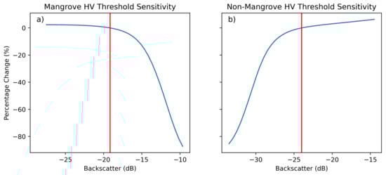 A sensitivity analysis was conducted to quantify the differences in the mangrove area mapped given the variation in the thresholds. The sensitivity analysis demonstrated that changes in the thresholds of <2 dB resulted in only small changes in the area of mangroves, with these being <2% (Figure 7).