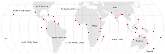 The accuracy assessment was undertaken in two parts. The first used the 60 validation sites from Bunting et al. [29] for 2010 to compare the accuracies of the GMW v3.0 2010 mangrove extent with the GMW v2.5 2010 baseline. This provided an assessment of the impact the SAR change detection processing had on the quality of the mapped mangrove extent. The second assessment focused on the accuracy of the change detection. This assessment defined a new set of 38 sites (Figure 8) covering a diverse range of geographic regions, mangroves types and change drivers that were considered to represent the full range of known and expected change events globally and included areas without changes. For each site, a degree reference area was located such that it overlapped with as much of the mangrove area as possible and usable historical Landsat imagery was available for multiple dates as an independent reference for mapped changes. The advantage of using Landsat data over other available historical optical datasets are that the inclusion of shortwave infrared channels allowed mangroves to be more easily distinguished and data were freely available for each site. The Landsat data (Collection-1 product) was accessed via the Google Earth Engine, with median composites of non-cloud pixels created using all the images acquired within the year of interest.
