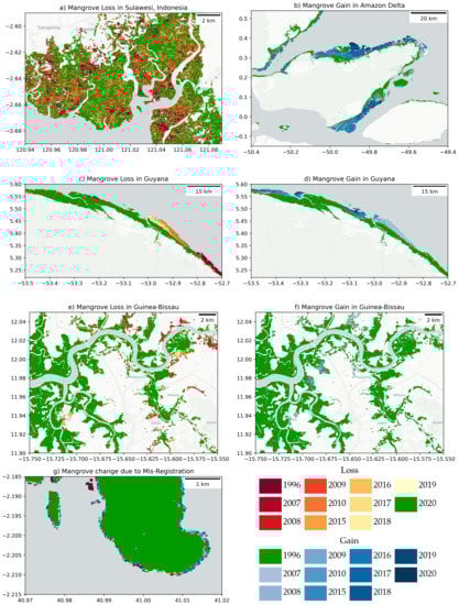 Examples of the mangrove change results. (a) Mangrove loss in Sulawesi, Indonesia, (b) Mangrove gain in Amazon Delta, (c,d) natural mangrove dynamics in Guyana, (e,f) anthropogenic mangrove dynamics in Guinea-Bissau and (g) an example of false mangrove gain and loss due to misregistration.