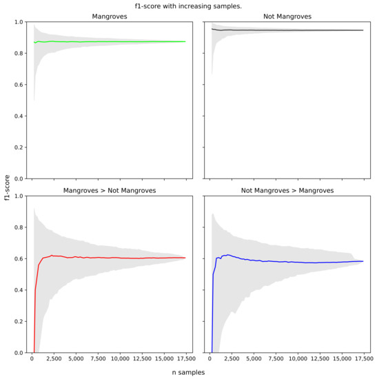 For the first, 500 points were distributed randomly within each area for a pair of randomly sampled years, with the condition that the base year had to be earlier than the change year. These points were not stratified for particular classes or temporal periods as sampling was proportional to the area mapped for each class and the temporal period was randomly selected. The number of change samples (’mangroves > non-mangroves’ = 139, ’non-mangroves > mangroves’ = 39) identified was naturally small, as these are globally rare. Therefore a second set of points was defined within regions where changes were known to have occurred (determined through manual annotations) or defined as change by the change analysis. The temporal period was also maximised using the earliest and latest year for which useable Landsat reference imagery were available. Within these change regions, further reference points (up to 500) were defined through random selection of pixels, where if the number of change pixels was ≤500 then half the available pixels were selected. By focusing the second set of points on the change regions, a sufficient number of reference change points was realised in a manageable amount of effort. The reference points were manually annotated with a reference class based on an informed interpretation of the Landsat imagery. Each of the 76 points sets (38 sites × 2 sampling methods) were then split into two (i.e., two sets of 250 points), where the first set were annotated with their reference class and the second set were randomly selected and annotated until sufficient points had been assessed. Sufficient points were deemed to have been annotated once the addition of new reference points did not significantly change the F1-scores of the change classes (see Section 3.3). This resulted in 11,769 non-mangroves, 4482 mangroves, 702 ’Mangroves > Non-Mangroves’ and 413 ’Non-Mangroves > Mangroves’ points being sampled. Therefore, the complete validation set had 17,366 reference points.