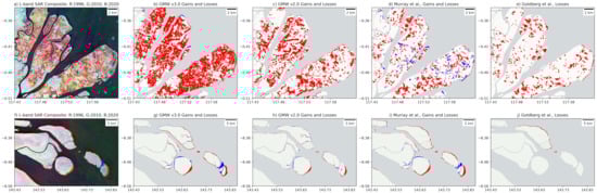 Within this potential change area, mangroves were associated with a high L-band backscatter and non-mangrove areas (e.g., water, mudflats, salt marshes) had a low backscatter. Changes in backscatter were assumed to represent a steady transition or abrupt change between these categories. The ability to detect such changes depends on the time separation between the observations as some natural processes (e.g., sea level fluctuation) or events (e.g., strong winds, floods) or human activities (e.g., the establishment of plantations or construction of new port facilities) might be mistaken for changes in mangroves if observations are several years or decades apart. This is particularly the case if the land cover at the observation time exhibits a backscatter signal similar to the mangrove or non-mangrove states. However, the extent of confusion was expected to be low, particularly as manual inspection and editing of the contextual mask had been undertaken a priori. The manual inspection involved the digitisation of regions which should be removed from the mask (i.e., incorrectly included within the mask) and additions to the mask (i.e., regions where mangroves could occur but were not included within the mask). Any pixels which were permanently water during the period were masked using the water ’occurrence change intensity’ layer 1984–2020 from Pekel et al. [40], where pixels which were water in both periods were removed from the potential mangrove change layer. In addition, regions of mangrove change from Bunting et al. [25] and Goldberg et al. [12] were included in the potential change area and, based on visual interpretation, regions known not to be mangrove change or otherwise were manually removed or added. Examples of this contextual potential change layer are shown alongside the 2010 GMW v2.5 baseline in Figure 3.