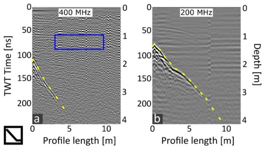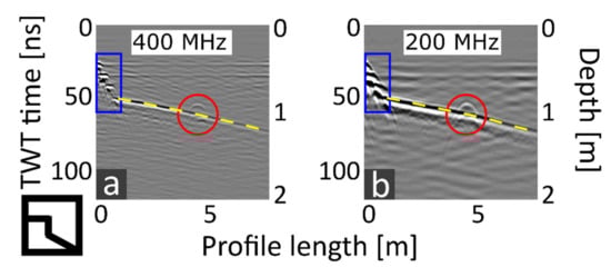 GPR profiles comparing (a) the 400 MHz and (b) 200 MHz antenna from GSSI using an SIR-4000 registration unit at the measurement location “swimming pool”. The data was processed with t0 correction, bandpass filter, fk-filter, background removal, and trace normalizing. The pool bottom is highlighted with a yellow dashed line; steps to the pool are framed blue; a lowered pipe is marked with a red circle.