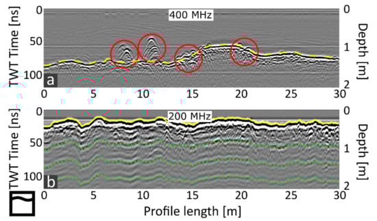 GPR profiles comparing (a) the 400 MHz and (b) the 200 MHz antenna from GSSI using an SIR-4000 registration unit at the measurement location “river”. The two antenna frequencies were used to prospect different sections of the river with varying water depths. The data was processed with t0 correction, bandpass filter, fk-filter, background removal, and trace normalizing. The river bottom is highlighted with a yellow (dashed) line; diffraction hyperbolas are marked with a red circle; multiples are emphasized via green dotted lines.