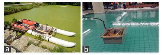 For the field measurements, 200 MHz and 400 MHz antennas from GSSI were used in combination with the SIR 4000 registration unit from GSSI. One measurement system (Figure 5a) included a small inflatable boat with an inflatable catamaran attached to the front. The antenna was fixed in a floating box, which was installed in the catamaran. The system was moved by an electric engine or manual rowing. The positioning for the measurement locations pond and river was realized using a total station with automatic target tracking. Thus, a coordinate was collected averagely each 30 cm. As an additional option, an RTK-DGPS (real-time kinematic differential global positioning system) was used for the measurements at the flooded gravel pit. In another setup for measurements in the swimming pool, only the floating box was used (Figure 5b). It could be towed inline in forward and backward directions with ropes. The ropes were marked each meter and used for manual positioning of the antenna with the help of measuring tapes on the edge of the pool.