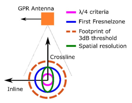 From our results, we can conclude that the Fresnel zone width is a robust estimate resolution under field conditions. The predicted effect of the narrowing of the antenna radiation pattern for water applications could be verified, but it does not seem to lead to an improvement of the spatial resolution of the reflection images at shallow target depth <1 m. This might be caused by the near-field component of the antenna radiation pattern, which we did not consider in our investigations.