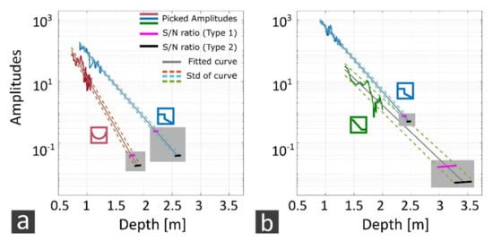 For estimating the maximum sounding depth, we need to relate the site-specific attenuation and spreading effects to the actual noise levels. An inspection of the field data shows that we find two sorts of noise in offshore GPR data: First, a coherent ringing occurring at all travel times that probably results from coupling the GPR antenna to a very low-permittivity medium or from interaction between the antenna and water vehicle or both (Type 1, water ringing, NC). Second, this is common, mostly random, electronic and environmental noise that increasingly dominates the record towards increasing travel times (Type 2, common noise, NR). However, the first factor in particular can be significantly reduced through appropriate processing (e.g., band pass filtering and background removal according to Section 3.1.2.). For quantifying the mean achievable signal-to-noise ratios (S/N)Mean, we compute the envelopes of the processed radargrams and from that form the quotient of the mean amplitude of a selected time window to the reference amplitude A0 from Equation (2). Representative amplitudes NC of the coherent noise (Type 1) are determined in a time window between the direct wave and lake bottom reflection, which is considered free of reflections, except in cases where scattering from floating organic particles is visible. Representative amplitudes NR of the random noise (Type 2) are determined in a time window at the very end of the envelope traces. Then, the mean observed S/N ratio is