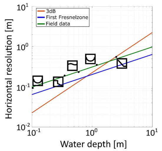 In our study, we were able to achieve spatial resolution in the centimeter range in the horizontal and vertical directions and to resolve branches and fish. The spatial resolution achieved can be fitted by a relation of type . It basically follows the curve of the 1st Fresnel zone width. We could verify the theoretically predicted radiation pattern and its narrowing in water compared to land applications. However, a corresponding positive effect on the resolution could not be recognized. Due to the narrow beam, however, fewer side reflections might be expected. Similar experiences were made in other studies when resolving objects. Among other things, ref. [] was able to resolve reeds and dirt particles, while ref. [] was able to resolve a beverage can with the 200 MHz antenna, ref. [] found tree trunks of various diameters, and ref. [] achieved a vertical resolution of <20 cm for the 400 MHz antenna and of <30 cm for 200 MHz.