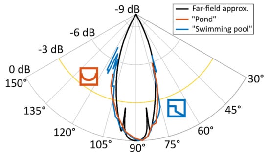 For measuring exemplary antenna radiation patterns, we sounded under water objects under varying radiation angles using a GSSI 400 MHz antenna. A lab-type experiment was conducted with an aluminum pipe lowered at the measurement location “swimming pool”. In a field experiment, we analyzed random objects found in the water column of the measurement location “pond”, most likely fishes. The processing applied consisted of spreading and attenuation correction. Then, the corrected amplitudes of the diffraction hyperbolas were picked and plotted versus the angular distance. The resulting E-field antenna patterns were then compared to the theoretical values from Equations (15) and (16).
