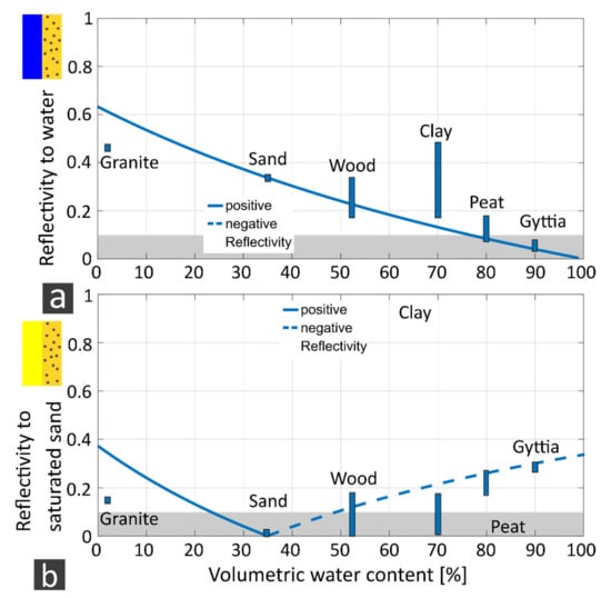 Figure 13 shows the physical parameter of relative permittivity as a function of the volumetric water content. Note that 0 vol% volumetric water content represents the rock matrix, and 100 vol% volumetric water content the fresh water (assuming full saturation). At the bottom of lakes, a layer of mud (that is, a layer of suspended organic or non-organic material) may form, which may show a gradual increase or a stratification in density with depth. Suspensions show a volumetric water content larger than a critical value that causes material fragments or grains to be completely surrounded by fluid such that they lose their mechanical stiffness (e.g., []). A typical order of magnitude of critical water content is 50% for sandy grain size (e.g., []). At the lake bottom, a stratification of different stages of the suspension could possibly occur. The curve of the relative permittivity (Figure 13) increases with increasing volumetric water content from the value of the rock matrix to the value of the freshwater. Figure 13 is required for the determination of the reflection coefficients in the next section.