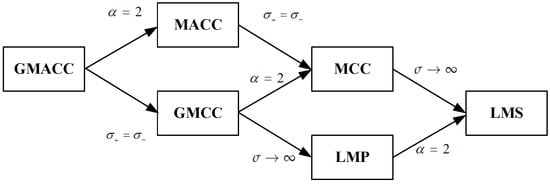 (2) When , the GMACC algorithm becomes the GMCC algorithm []. When the two conditions and are both satisfied, the GMACC algorithm becomes the MCC algorithm. Furthermore, according to the properties of the GMCC, when , the GMACC algorithm becomes the least mean p-norm algorithm (LMP), while when and , the GMACC algorithm becomes the LMS algorithm. It can be found that GMACC is a broad concept, which includes many algorithms as its special cases. The relationship between the GMACC and other algorithms as its special cases are presented in Figure 1.