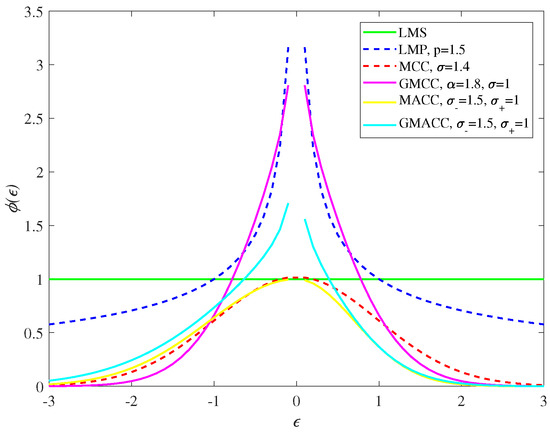 (5) The difference between the GMACC and other algorithms can be also attributed to the difference of the weighting functions of the algorithms. The weighting functions of robust adaptive filters usually assign less weight to data outliers or large estimation error caused by impulsive noise, which keeps the algorithm robust in a non-Gaussian noise environment. The weighting functions of different algorithms are presented in Figure 2, which shows that ITL-inspired criteria assign very little weight on sample data that cause a large estimation error compared with the MMSE criterion and least p-norm criterion, and the asymmetric criteria assign different weights on the positive and negative estimation errors even though they have the same absolute value.