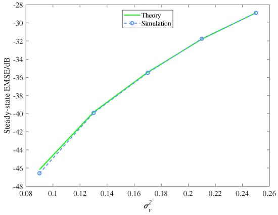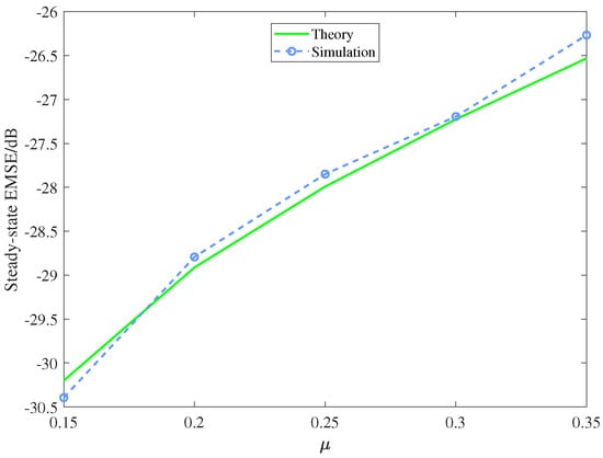 The steady-state performance of the GMACC algorithm under different step sizes and noise distributions were simulated. The noise in the simulation was a uniform noise distributed in [−m, m]. When the step size and noise variance were changed, the other parameters were kept unchanged, that is, the kernel width was set to 0.5, and the shape parameter was set to 2. For each simulation under a certain parameter setting, 100 Monte Carlo runs were executed to get the average simulation result of the EMSE. When calculating the steady-state results of the EMSE, the mean value of the EMSE of the last 500 iterations was taken as its steady-state value. In order to ensure that the algorithm could converge to the steady state in the last few hundred iterations, 5000 iterations were set in each Monte Carlo simulation. Considering that too small a step size leads to too slow a convergence of the algorithm, the step size should be adjusted appropriately to avoid too small a step size. The comparison between theoretical analysis results and experimental results is shown in Figure 3 and Figure 4.
