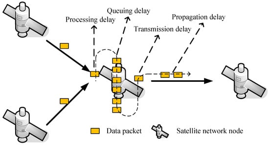 Generally speaking, the satellite network delay includes four parts: processing delay, queuing delay, transmission delay, and propagation delay. Figure 5 shows the components of the delay in the satellite network. The processing delay includes the time that the node checks the packet header and determines how to send or process the packet according to the packet header information, as well as the time to check whether the packet is misplaced, etc. The processing time is usually negligibly small. The transmission delay refers to the time required for the router to send packets onto the wire. The time is related to the length of the packets and the speed of the router to send packets. According to the actual packet length and network bandwidth parameter level, the transmission delay is small, and accounts for a low proportion in the overall network delay. The propagation delay refers to the time spent by an electromagnetic wave carrying data information going through the propagation channel, which can be calculated by dividing the channel length by the propagation rate of the electromagnetic wave in the channel. In the long-distance and dynamic channel of a satellite network, the influence of the propagation delay is obvious, while in the medium- and short-distance channel of a ground network, the influence of the propagation delay on the overall delay is limited. In most networks, the queuing delay accounts for a high proportion of the total network delay and is the decisive factor of the network delay variation. The queuing delay refers to the time that a packet is waiting to be sent in the router queue after it arrives at the router. For a specific packet, the queuing delay depends on the length of the queue in which the packet is located and the speed at which the router processes and sends the packet. For a specific queue, the queuing delay depends on the arrival strength and distribution characteristics of packets. Studies have shown that if there are 10 IP packets queued by 10 routers on average, the queuing delay on this path can reach hundreds of milliseconds [,].