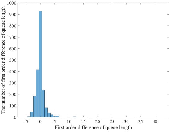 To make the discussion more convincing, this paper simulated the queue delay in MATLAB software (version 9.3) [] and described its specific asymmetric characteristics inspired by the idea of queuing theory. According to the previous discussion, the arrival packet traffic in a network node queue is sudden and unpredictable, and the speed of packets leaving the node queue is constant. Suppose that there are two kinds of service packets passing through one certain network node in a period of time. The packet arrival process of one service is relatively stable, while the arrival process of the other service is very sudden and explosive. The speed of the network node processing a data packet is constant. According to the above settings, the number of packets arriving at each time and the number of packets processed can be simulated and calculated in MATLAB. Then, a time series can be generated to represent the change of the number of packets in the node queue over time. It should be noted that this paper assumed that the upper limit of the simulated queue length was large enough, so there was no packet loss. In the case of a constant processing speed, the queue length is proportional to the queue delay, so the change of the queue length can also represent the change of the queue delay. In this simulation, the queue length of nodes, the first-order difference of the queue length (i.e., the change of queue length), and the statistical distribution of the first-order difference are shown in Figure 6, Figure 7 and Figure 8, respectively.