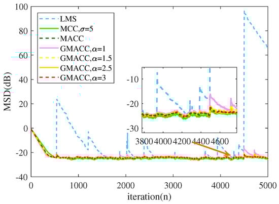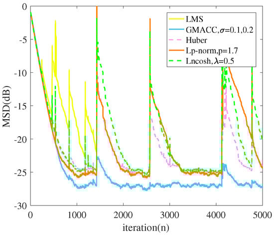 Simulation 5: In this simulation, the GMACC was compared with other robust adaptive filtering algorithms such as Llncosh [], least p-norm [], and Huber algorithm []. The system noise was set the same as that of simulation 3 and 4. The parameters setting and steady-state MSD of the algorithms are shown in Table 5, and the simulation results are shown in Figure 14.