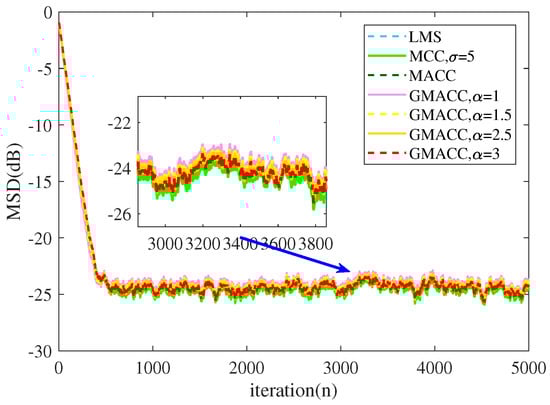 It can be observed from Figure 13 that the GMACC with a proper shape parameter can outperform the MACC in terms of the steady-state MSD under the same convergence rate.