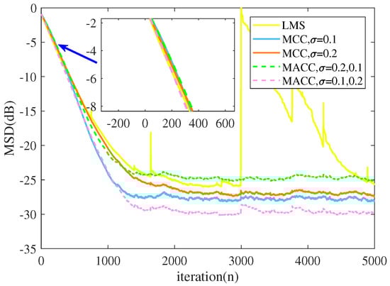 Simulation 3: Next, we simulated the comparison among the MCC, MACC, and LMS when the disturbance term followed an asymmetric non-Gaussian distribution. It has been described that the queue delay is asymmetric due to the sudden increase of user request and the limited processing speed of the network nodes. According to the above characteristics of the queue delay, an asymmetric alpha-stable noise [] with a lower bound was generated in this simulation, so as to simulate the disturbance term in the network delay time series. The noise parameters are shown in Table 2. The performance of the MACC and MCC with different kernel widths was compared under the condition of asymmetric noise. For a fair comparison, the initial convergence speed of the algorithms were set to be the same, which is similar to the simulation in []. For one algorithm, the faster the initial convergence speed was, the less optimal the convergence step was. The parameters of the algorithms are presented in Table 4. We took the mean MSD of the last 1000 iterations as the steady-state MSD and present the results in Table 4. The convergence process and the steady-state performance results are shown in Figure 12.