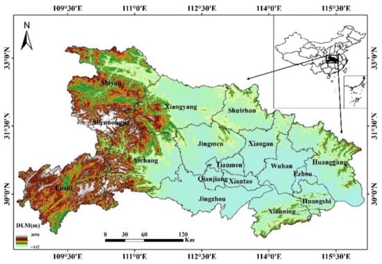 We selected Hubei province as our study area, which is located in central China and the middle reaches of the Yangtze River. The study area is set between latitudes 29°~33°N and longitudes 108°~116°E; it is an incomplete basin surrounded by mountains on three sides (Figure 1). There are 17 cities with a total area of 185,900 km2, which is approximately 1.94% of China. The total crop production in Hubei province was 27,274 Gg in the year of 2020, and has been stable at more than 25,000 Gg for eight consecutive years, accounting for 4.07% of that in China.