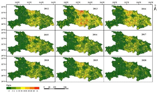 The emissions of all pollutants from crop residue open burning in 2012–2020 had similar annual variation characteristics, with an overall trend of first rising and then falling (Figure 3). As it was shown in Figure 3, the emissions peaked in 2013, increasing by 113–120% compared to 2012. In 2013, Hubei Province had not yet implemented a strict straw burning ban policy, so the amount of crop residue open burning was still increasing. Since 2014, with the adoption of strict control policies, the emissions from crop residue open burning gradually slowed down year by year, with a small rebounded in 2019. Emissions were reduced to their lowest level in the past 9 years in 2020, which were only about 18–20% of the total emissions in 2013.