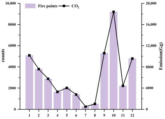 To better understand the spatial-temporal variation patterns of emissions from crop residue open burning, this paper analyzed the monthly CO2 emissions and the number of fire point as illustrative examples (Figure 6). As seen in Figure 6, the monthly number of fire points and CO2 emissions had obvious seasonal variations. More agricultural fires mainly occurred in September and October, with a number of 14,502, accounting for 37.14% of the total number of fire points. The number of fire points peaked in October, with a number of 9202, accounting for 23.56%. In addition, there were some scattered small peaks of fire in other months.