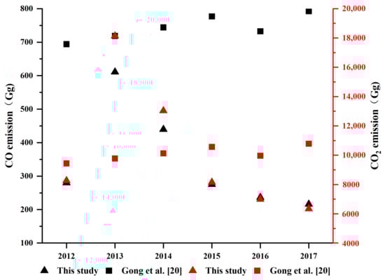 The spatial distribution of crop residue open burning is very dispersed and the combustion process is rapid, which makes it difficult to monitor its emissions using conventional ground investigation. Most current studies have verified the accuracy of the emission inventories by comparing them with previous studies, and analyzed their uncertainties through Monte Carlo simulations. Therefore, the emission inventory of Hubei Province was compared with the results of previous research with the same study area cited in Table 1. And it was found that there were large differences (Figure 7 and Table 6). Compared with the CO and CO2 emissions derived from Gong et al. (Figure 7), the differences ranged from 14.98% to 72.7% and from −85.55% to 41.21%, respectively []. For CO emission, the results of Gong et al. were overall higher than those in this study, which was mainly caused by the selection of EFS and OBP. On one hand, the EF of CO for various crop types used in this study was generally lower than the same EF used for all crop species in Gong et al. On the other hand, the OBPS for different crop species for multi-years used in Gong et al. were constant values (19.1–27.8%), while the annually updated OBPS based on the VIIRS fire counts ranging from 28.24 to 57.69% were used in this study, which was reasonable. For CO2 emission, the difference was small in 2012. During 2013–2020, the annual emission of Gong et al. changed very little, while the emission of this study declined drastically due to the use of the annually updated OBPS. The pollutant emissions estimated by using changing OBPS were more reliable under the strict straw burning ban policy in Hubei province. Compared with the pre-2006 emission inventory, the emissions in this study were much higher. The differences might attribute to the gradual increase in crop production. From 2003 to 2006, the yield of major crops in Hubei was about 18,000–20,000 Gg, while in 2012 it was about 28,000 Gg, the differences in crop production and the proportion of open burning both affected the estimation results of the inventory. In addition, compared with the emissions derived by Wang et al., the differences in CO2 emissions were relatively high []; these differences were mainly caused by the selection of EFS. The EFS of CO2 employed in Wang et al. was a constant value for various crop types, was 151.5 g/kg, while the value in this study was 791.3–1557 g/kg for different residues; this study synthesized the results of recent EFS experiments and provided more accurate results.