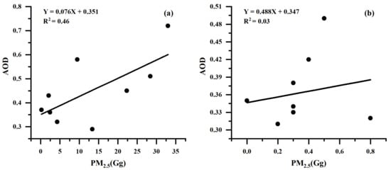 Comparison of PM2.5 emissions with AOD during the straw burning season (a) and non-straw burning season (b) during 2012–2020.