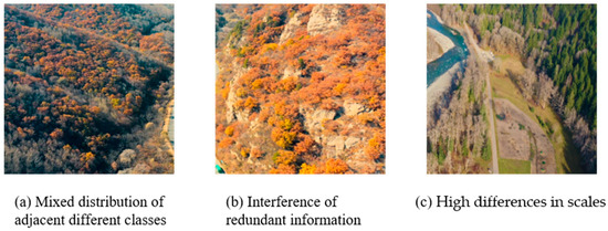 - Interference of redundant information: Due to the complexity of the forest environment, remote sensing images captured by UAVs typically have irrelevant semantics or noise, e.g., exposed rocks, shaking water streams, vignettes due to lens shake, etc. The abovementioned redundant information may trigger the gradient explosion problem during the neural network training.