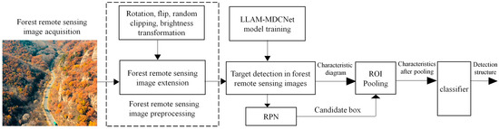 The workflow diagram of LLAM-MDCNet is shown in Figure 2. First, the remote sensing images are preprocessed. Image preprocessing is divided into two parts: image annotation and image augmentation by rotation, flip, random cropping, and brightness transformation. Following that, the feature extraction network MDCN is utilized to extract the features in the remote sensing images. Then, the target bounding box is generated by RPN for the output features. The detection network consists of an ROI pooling layer and a classification and regression layer. The ROI Pooling layer outputs its pooled features and feeds them to two cascaded, fully connected layers for feature mapping before outputting them to the classification and regression layers. The fully-connected layer is decomposed into two sub-fully connected layers using singular value decomposition (SVD), which accelerates the computation of the fully-connected layer and significantly reduces the computations. The classification layer and regression layer adopt the same structure and loss function calculation method as the correlation layer in the RPN, and further classify and regress the candidate regions through the classification and regression network. Finally, remove the redundant detection frames using the non-maximum suppression method to obtain the final object detection results of forest remote sensing images for dead and old tree clusters.