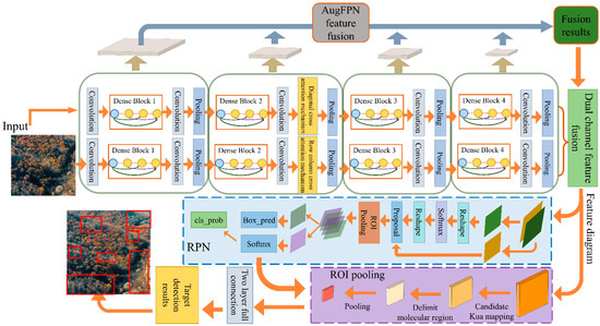 The combination of different multi-directional attention mechanisms in the two different paths not only enhances the network’s ability to detect small clusters of dead trees scattered among healthy tree clusters but also to capture global features of the image. Thus, it can effectively improve detection accuracy when clusters of dead trees are detected. Further, low-level texture features and high-level semantic information are better combined using AugFPN for up-sampling to fuse their features. The low-level texture features can significantly characterize the contrast of the color features of healthy trees, and the high-level semantic features can express the overall trend of irregular dead tree clusters. Combining images at different levels improves the network’s detection effect of dead tree clusters with high-scale differences. Then, the target bounding box is generated by RPN for the output layer.