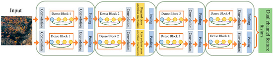 MDCN consists of two identical DenseNet skeletons in parallel, and feature extraction is performed on the input image in each independent dense composite path. The structure of MDCN mainly consists of Dense Blocks and Transitions. There are 4 Dense Blocks in a DenseNet and multiple Bottleneck layers in a Dense Block. Normal convolutional networks generate connections in the layer of the dense composite path. Still, the densely connected module passes the feature overlay mapping from the previous layer to the other subsequent layers using dense connections. Each layer is connected with all previous layers in the channel dimension by concat, enabling the combination of multiple features, reducing the number of parameters, and enhancing feature reuse. Therefore, in the network with layers, our network has connections. The expression for the dense connection module is as follows, where represents the output feature map of layer .
