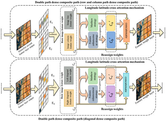 With the development of computer vision, various attention mechanisms have been proposed to address the lack of attention of neural networks to high-level semantics, which serves to ignore redundant features on the image that are not of interest, thus making the computer pay more attention to useful information on the image [21,22,23]. This selective attention mechanism is consistent with some of the mechanisms in discriminative detail features. Therefore, for more complete extraction of the underlying features and semantic features in the forest images, we introduce the Longitude latitude attention mechanism (LLAM) with different attention directions in two paths of the Double path dense composite path. The following figure shows the LLAM algorithm in row-column and diagonal directions. The working principle of Llam is shown in Figure 6.