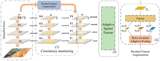 To preserve as much as possible the detailed features of dead tree clusters in images so that the dead tree cluster features, regardless of size, can be effectively detected by the MDCN and yield the correct detection results, we added AugFPN [24] to the network to fuse the features of different scales. The reason is that although the forest cluster images input into MDCN’s two paths extract a large number of forest cluster features by convolution, the perceptual field of image features becomes larger and inevitably accompanied by the loss of small dead tree cluster features with the fragmented distribution. Therefore, in this paper, we first concatenate the convolutional paths in row-column and diagonal directions and add the AugFPN after the fused layers. This structure groups the layers that do not change the size of the feature map into a stage in the forward propagation of the network, and up-samples the feature map, then fuses the two and performs the convolution through the lateral connection. The advantage of this is to use both the high-resolution information of the lower layer features and the high semantic information of the higher layer features to predict by fusing them. The schematic diagram is shown in Figure 7, where B1~4 represent the four layers of MDCN with an added attention mechanism. M1~4 layers represent the auxiliary losses of the four layers, and P represents the main loss. The same supervisory signal is added to the features of each layer. In the following, the algorithm principle of AugFPN is shown specifically.