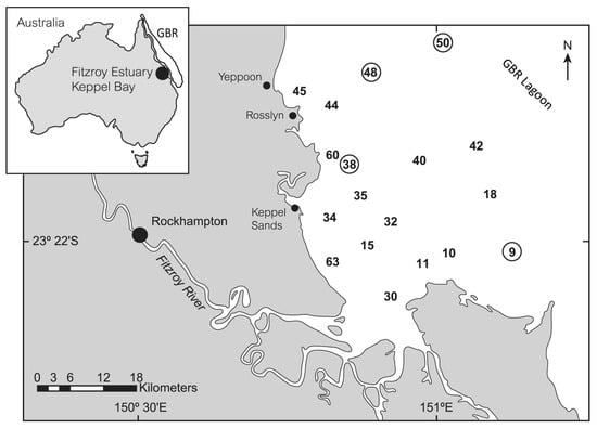 Map of the Keppel Bay–Fitzroy River Estuary. Numbers indicate sampling sites and circled numbers indicate sites where UV-absorption peaks were present in the CDOM fraction.