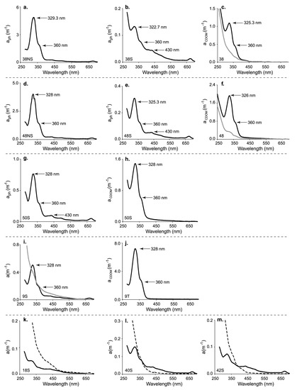 Spectra of the absorption coefficient for the phytoplankton (aph) and dissolved (aCDOM) fractions in samples collected at sites within Keppel Bay. (a) aph for the near-surface layer (NS) sample at site 38; (b) aph for the surface (S) sample at site 38; (c) aCDOM for the surface sample (grey line) and the near-surface layer sample (black line) at site 38; (d) aph for the near-surface layer (NS) sample at site 48; (e) aph for the surface (S) sample at site 48; (f) aCDOM for the surface sample (grey line) and the near-surface. layer sample (black line) at site 48; (g) aph for the surface (S) sample at site 50; (h) aCDOM for the surface sample at site 50; (i) aph (black line) and aCDOM (dotted grey line) of the surface sample at site 9; (j) aCDOM for the water sample from the outflow of the ac-9 (T) at site 9; (k) aph (black line) and aCDOM (dotted line) of the surface sample at site 18; (l) aph (black line) and aCDOM (dotted line) of the surface sample at site 40; (m) aph (black line) and aCDOM (dotted line) of the surface sample at site 42.