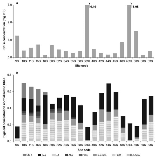 Pigments that relate specifically to an algal class are termed marker or diagnostic pigments [38,39]; some marker pigments are found exclusively in one algal class (e.g., alloxanthin, which is only found in cryptophytes), while others are the principal pigments of one class but are also found in other classes (e.g., fucoxanthin in diatoms and some haptophytes). The presence or absence of these diagnostic pigments can provide a simplified guide to the composition of a phytoplankton community. Four stations (9, 38, 48, 50) had the highest values of phytoplankton biomass, as indicated by the concentration of chl-a (Figure 4a), and the pigment composition (Figure 4b) indicated the samples to be totally dominated by cyanophytes-Trichodesmium spp. (as indicated by zeaxanthin). In contrast, the phytoplankton assemblage at other stations was a mix of cyanophytes, probably Trichodesmium (zeaxanthin), diatoms (fucoxanthin), haptophytes (hex-fucoxanthin), and at some stations, small amounts of cryptophytes (alloxanthin), prasinophytes (prasinoxanthin) and euglenophytes (chl-b). At sites 38 and 48, the concentration of chl-a was enhanced in the near-surface layer compared to the surface layer by values of 16.8 and 9.2, respectively.