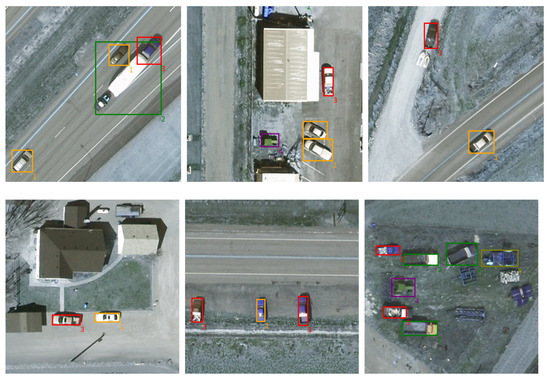 Qualitative results of YOLOX-s on xView. The contrastive mutual guidance helps to recognize intricate objects. The number and color of each box indicate the vehicle class.