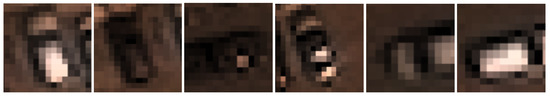 Contrastive learning is a discriminative approach to visual representation learning, which has proven effective for pre-training networks before transferring to an actual downstream task [16,17,18,19,20]. The well-known SimCLR framework [16] proposes applying image augmentation to create an image’s positive counterpart, eliminating the need for manual annotations for pretext tasks, hence self-supervision. Our hypothesis is that different objects of the same class from aerial points of view could be considered as a result of compositions of multiple augmentation operations, such as cropping, scaling, re-coloring, adding noises, etc., which, as shown by SimCLR, should be beneficial for representation learning (Figure 2). Thus, by pulling together same-class objects and pushing away the others, the network could learn to overcome the environmental diversity and better recognize the objects of interest.