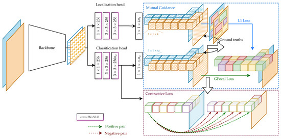 An overview of our framework: the backbone network encodes a batching input before passing the extracted features to the localization and classification heads, which predict 4-tuple bounding box values and -class confidence scores for each anchor box. The mutual guidance module re-ranks the anchor boxes based on semantic information from the classification branch and improves the confidence score with localization information. The ground truth categories of the anchor boxes are used to supervise the contrastive loss. The pipeline is illustrated with a batch size of 2 and the number of anchor boxes .
