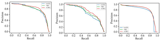 Precision–recall curve of YOLOX-s on 3 datasets, from left to right: VEDAI12, VEDAI25, and xView30. The methods with +CMG gain improvement over the others at around recall level of 0.5 for the VEDAI datasets and both +MG and +CMG outperform the vanilla method on the xView dataset.