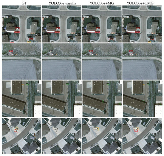 Comparison to the state-of-the-art. In Table 5, we compare our method with several state-of-the-art methods on the three datasets. Our YOLOX backbone with the CMG strategy outperforms others on the VEDAI datasets and is on par with YOLO-fine on xView. From the qualitative results in Figure 7 and Figure 8, respectively, for the VEDAI and xView, it can be seen that although the xView dataset contains extremely small objects, our method, without deliberate operations for tiny object detection, can approach the state-of-the-art method specifically designed for small vehicle detection [28]. A breakdown of performance for each class of VEDAI is shown in Table 6.