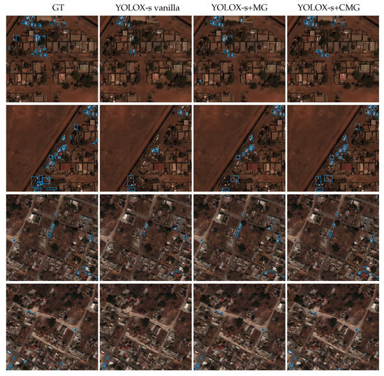 Some qualitative results on the VEDAI25 and xView datasets can be found in Figure 5 and Figure 6, respectively. Several objects are missing in the second and third columns, while the CMG strategy (last column) is able to recognize objects of complex shape and appearance.