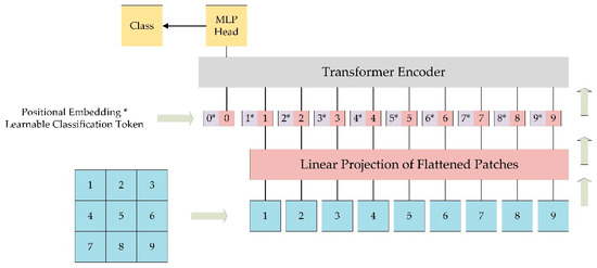 Transformer [17] was originally proposed for natural language processing (NLP) tasks, which replaced the Recurrent Neural Network (RNN). In recent years, Transformer has been used in classification tasks. A guided transformer for classification is the vision transformer (ViT). ViT [18] divides an image into several patches as the input of the model, where the size of one patch is 14 × 14 or 16 × 16. The overview of ViT could be found in Figure 1. Swin Transformer [19] is one of the best transformer models, which uses window attention to combine both global and local information. The experiment results show that the transformer model could obtain a good classification accuracy when a huge number of samples is provided. However, when the number of samples is not so huge, the CNN models would perform better. In short, the transformer models lack inductive bias and need a huge number of samples to complete training [20].