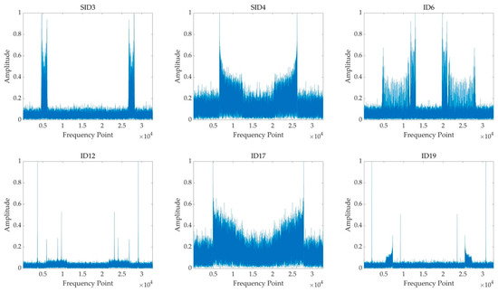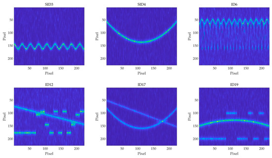 Figure 5 shows the preprocessed results of six modulation samples in SID3, SID4, ID6, ID12, ID17 and ID19 when SNR is 0 dB. In order to make the samples more visible, the TFIs of these samples based on SPWVD in [15] are shown in Figure 6.