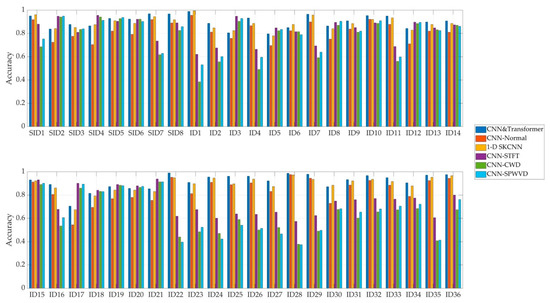 Table 7 shows that the data preprocessing time of CNN-STFT, CNN-CWD and CNN-SPWVD is around 3 times, 54 times and 57 times, respectively, than that of 1-D model-based methods. In addition, the length of the original sampled sequence ranges from 5000 to 30,000 points. The input shape of 1-D based model is a 32,768-length vector. However, the input shape of the TFI-based model is a matrix with 224 × 224 dimension that requires 1.5 times more space to save TFIs data compared with 1-D-based methods. Based on the mentioned analysis, it could be found that the 1-D model-based method has advantage of higher speed and low storage usage in data preprocessing stage.