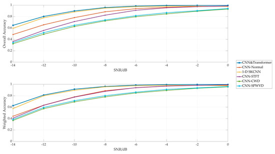The SNR is defined as , where and are the pure signal power and AWGN power, respectively. The SNR ranges from −14 dB to 0 dB, with 2 dB increment. Every 2 dB, 400 samples, 100 samples and 200 samples for each type of intra-pulse modulation are generated for training, validation, and testing, respectively. Therefore, the training dataset, validation dataset and testing dataset include 140,800 samples, 35,200 samples and 70,400 samples, respectively.