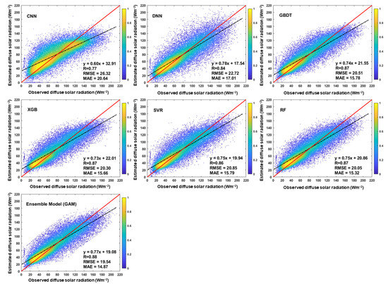 Figure 3 presents the density scatterplots between the observed and estimated diffuse solar radiation using the GAM and the six base ML models. Overall, the ML models perform well, with R values ranging from 0.77 to 0.88, RMSE values ranging from 19.54 to 26.32 Wm−2, and MAE values ranging from 14.87 to 20.64 Wm−2. The sample-based CV R values are in the order of GAM (0.88) > RF (0.87) = XGB (0.87) = GBDT (0.87) > SVR (0.86) > DNN (0.84) > CNN (0.77). The RMSE and MAE values presented opposite trends, suggesting that GAM outperforms the six individual models in diffuse solar radiation prediction (RMSE = 19.54 Wm−2 and MAE = 14.87 Wm−2). Of the three ML algorithms, the model performance of the boosting algorithm (GBDT and XGB) and others (RF and SVR) were quite close and better than deep learning (CNN and DNN). The overall model performance from GAM outperforms any single algorithm. It is worth noting that all models have some low-value overestimation and high-value underestimation, but GAM has improved on this issue. While the R value from GAM, compared to the single ML models, is not large overall, it affects the linearity of the association between the predictor variables and diffuse solar radiation.