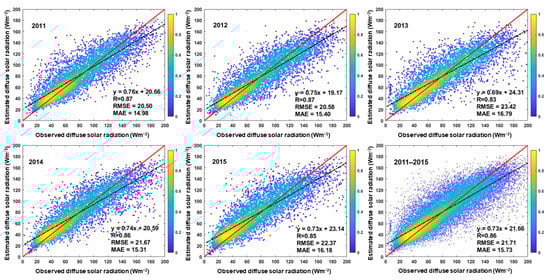 The dataset was randomly split according to the monitoring years in the by-year CV, using the same processes as the sited-based CV. The scatterplot of by-year CV, based on GAM, is shown in Figure 4, with the best estimation performance in 2012 and worst in 2013. The by-year CV R (0.86) is slightly lower than the sample-based CV R (0.88), whereas the RMSE and MAE values (21.71 and 15.73 Wm−2 for the by-year CV) are significantly higher than the sample-based CV result. R varies from 0.83 to 0.87, with a mean and standard deviation of 0.86 and 0.02, respectively, and ∼80% of the years have R greater than 0.85. The RMSE at each year ranges from 20.50 to 23.42 Wm−2, with a mean and standard deviation of 21.71 and 1.24 Wm−2, respectively. About 60% of the stations have RMSE values smaller than 22 Wm−2. A total of ∼40% of the years have MAE values higher than 16 Wm−2, with values ranging from 14.98 to 16.79 Wm−2. The mean and standard deviation of MAE for all years are 15.73 to 0.74 Wm−2, respectively. Overall, the GAM estimates diffuse solar radiation well. Both the site-based and by-year CV approaches illustrate satisfactory predictive capability, with no apparent overfitting, implying the reliability of GAM in predicting diffuse solar radiation spatial and temporal variability.